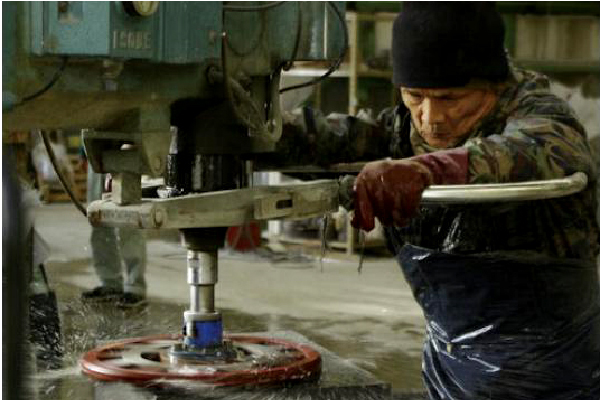 墓石加工工場にて、図面に沿って職人が加工を行います。